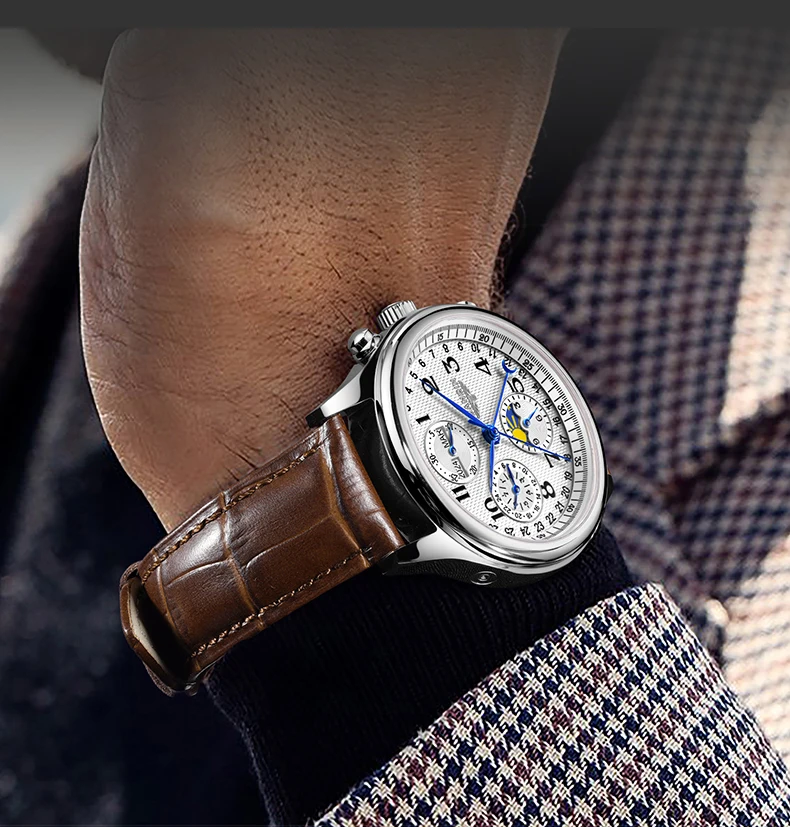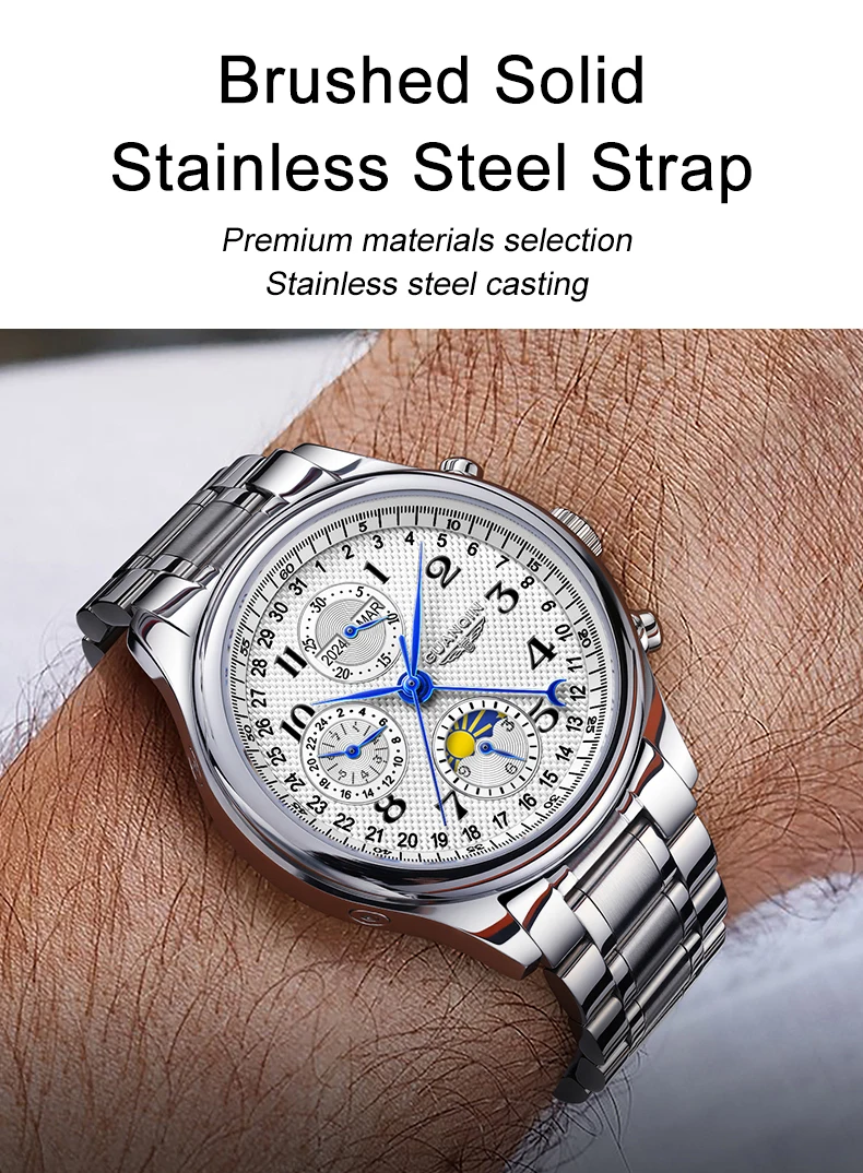 Integrates day, month, year, 24h, 12h, 60s bezel & calendar display.Maximizing functional versatility,business-inspired minimalist design, streamlined elegance that follows your every move.Innovative hand design, 3D embossed logo, ergonomic multi-function crown. Refined masculine elegance with meticulously crafted details.