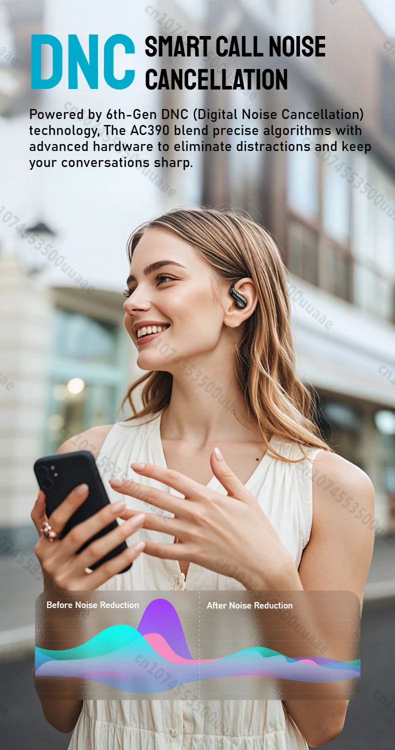 [ DNC Smart Call Noise Cancellation ] Powered by 6th-Gen DNC (Digital Noise Cancellation) technology, The AC390 blend precise algorithms with advanced hardware to eliminate distractions and keep your conversations sharp. Whether you’re navigating bustling streets, crowded commutes, or noisy cafes, the intelligent system actively identifies and neutralizes background noise, from traffic rumble to chatter, ensuring your voice comes through as clearly as if you were speaking face-to-face. No more repeating yourself, no more missed words: just seamless, distraction-free communication, wherever life takes you. Stay connected, stay focused, noise cancelling redefined.