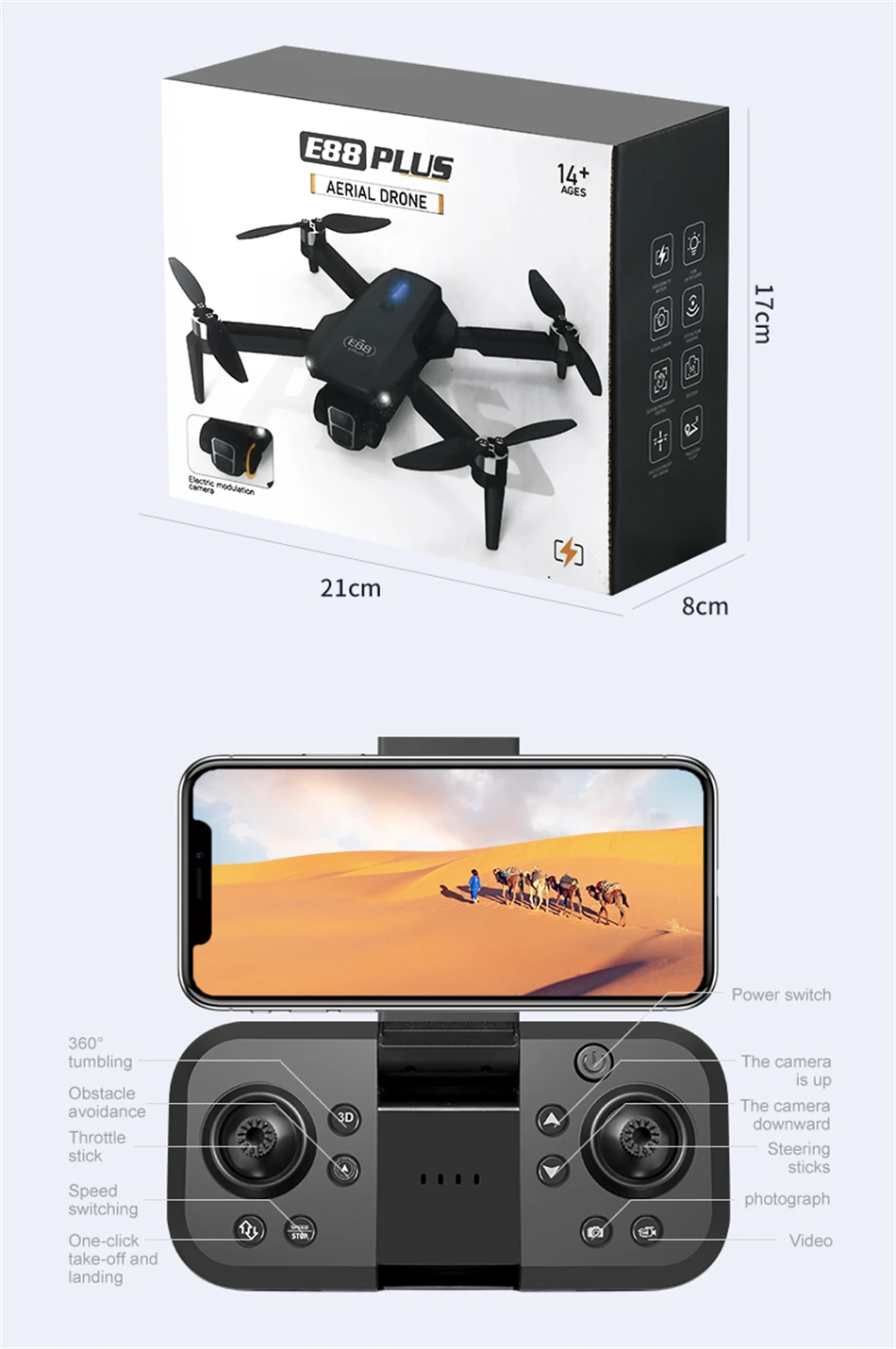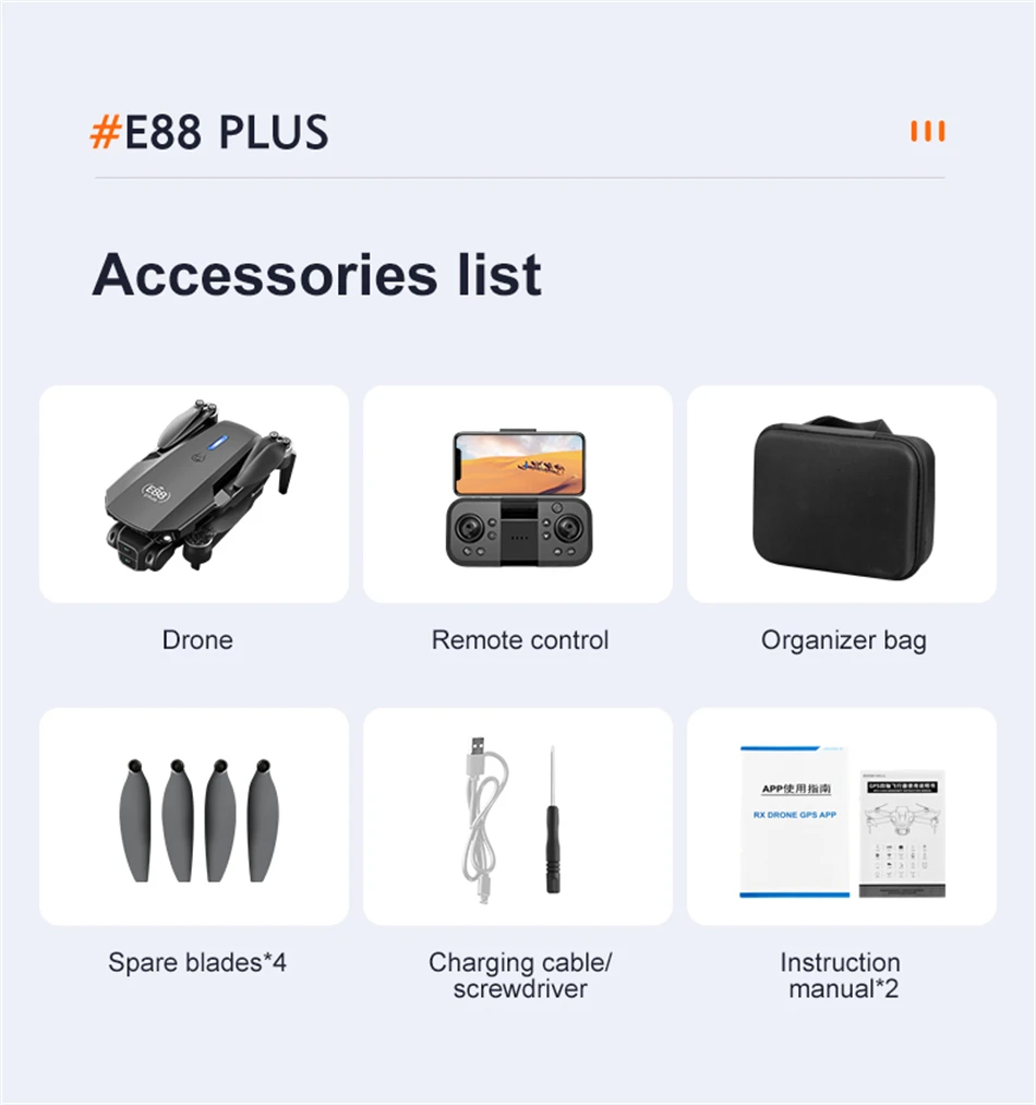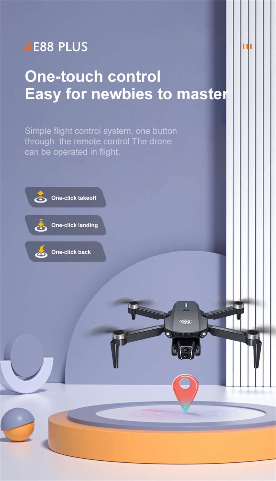 Optical flow positioning, the camera can be remotely controlled and electric to adjust 90°, fixed height function, 360° roll, the aircraft can be folded, six-pass with gyroscope, one-click calibration, one-click takeoff, one-click landing, rise and fall, forward and backward, left and right, side flight, steering, headless mode, fuselage light/head light (with camera can add functions: gesture photography, video recording, headless mode, emergency stop, trajectory flight, gravity sensing, music, 50x zoom, automatic photography)