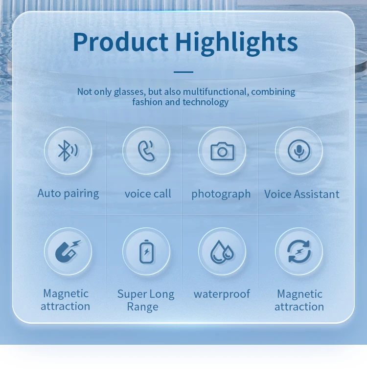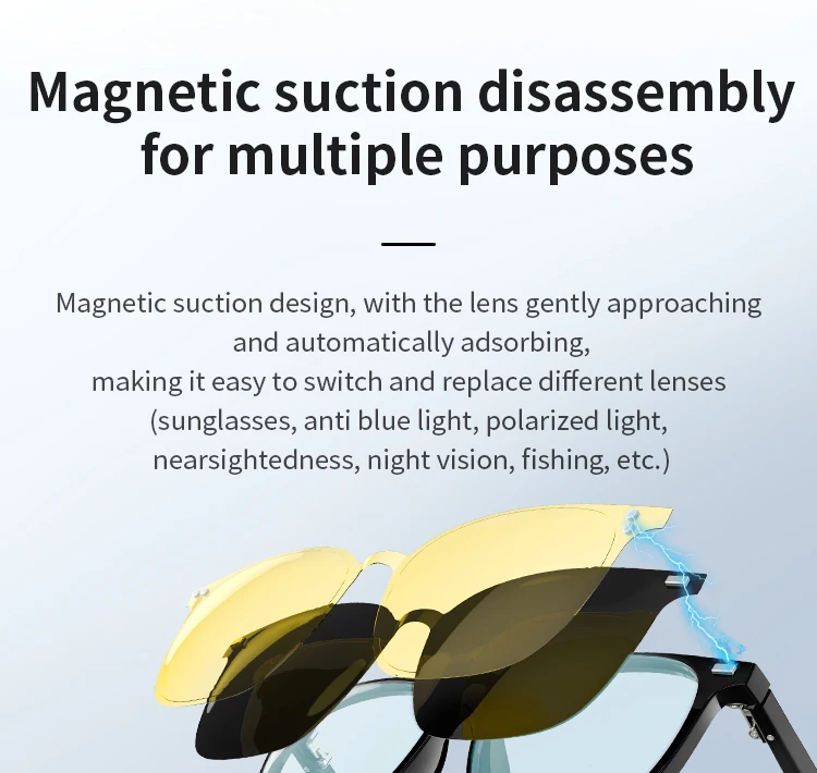 1. It can be used as sunscreen or sunglasses for blue light glasses. It is a magnetic lens that is easy to replace. You can go to a local eyewear store and replace the lenses of smart glasses with nearsighted lenses or purchase lenses of other colors. Changing the lenses will not affect the smart function of the glasses.