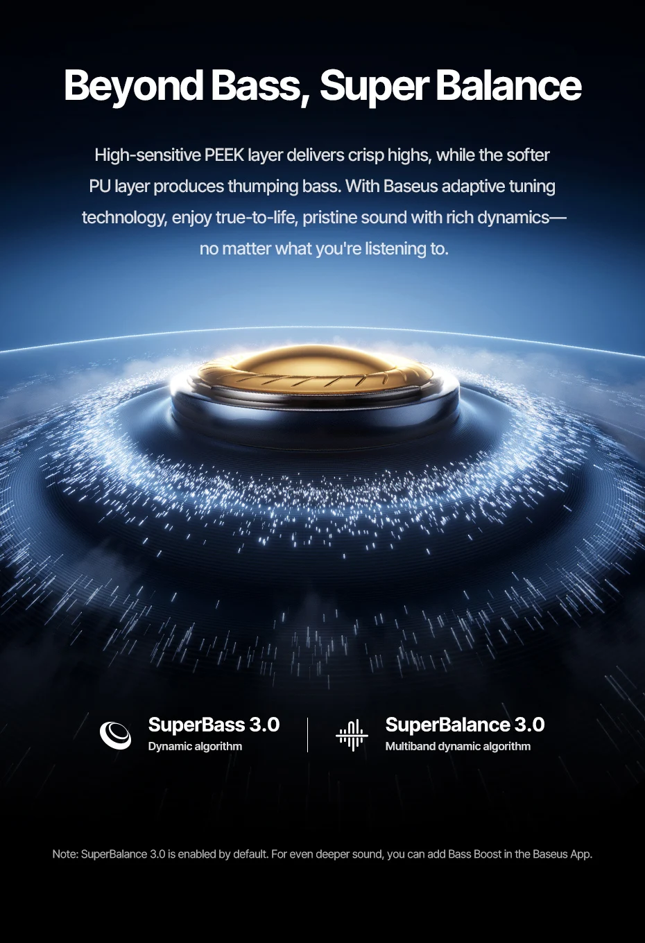 Dual-layer PU+PEEK diaphragms deliver crisp highs and powerful bass.Combined with Baseus's SuperBass 3.0 and SuperBalance 3.0 adaptive tuningtechnologies, these noise-cancelling wireless earbuds deliver dynamic, high-fidellty sound that adapts to what you're listening to .