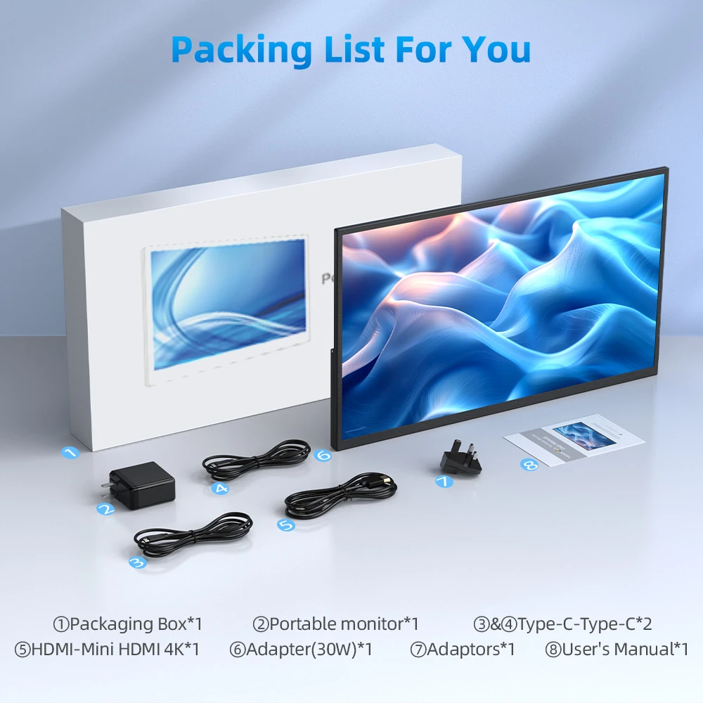 【Wide Compatibility】 The big portable display has two USB-C ports and one Mini-HDMI port, equipped with 2 USB-C to USB-C cables, 1 MINI HDMI to HDMI cable and 1 adapter (30W) in the package, so you can easily connect it to any major device you have, like Macbook, Surface, laptop, PC, Xbox, Switch, PS4/5 and more. If you meet the issue of screen being too dark or flickering, normally caused by insufficient power supply, then please use the original power adapter.