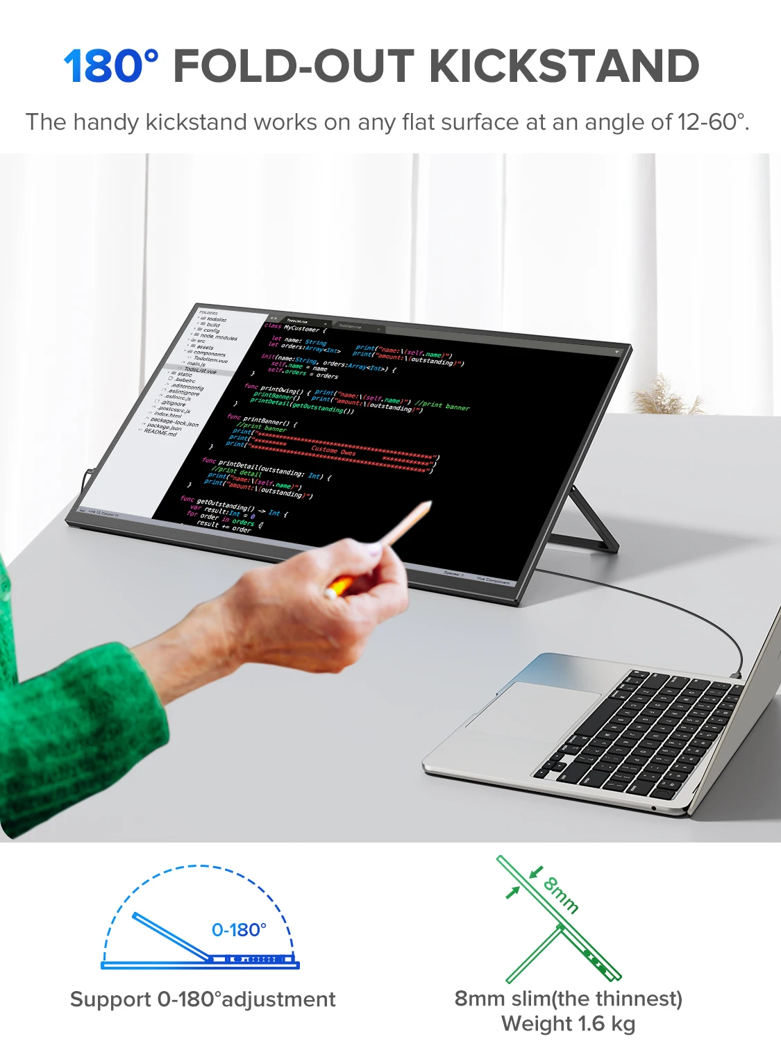 【180°Adjustable Stand and VESA Mount】 With a built-in 180° adjustable stand, you can easily tilt, rotate, and swivel the monitor to find the perfect ergonomic position. The built-in stand can be used for vertical screens without external bracket, providing you with flexibility and convenience to improve productivity. With VESA (75x75mm, M4*4mm) support, you can easily mount the portable monitor to a wall, monitor arm, or any other VESA-compatible mounting system. This is especially valuable for users who want to save desk space or create a multi-monitor setup.