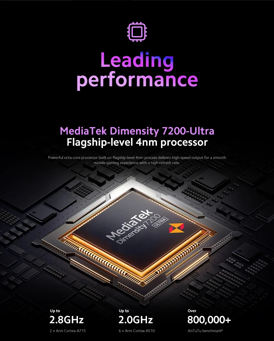 CPU -------------MediaTek Dimensity 7200-Ultra, 4nm manufacturing process, up to 2.8GHz