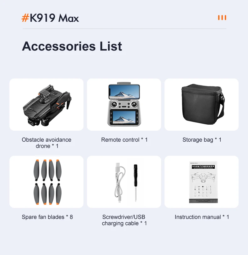 Drone (including battery) * 1 remote control (4.5-inch screen) * 1 infrared obstacle avoidance (optional laser obstacle avoidance) * 1 spare propeller * 4 spare screws * 4 screwdriver * 1 storage bag * 1 color box * 1
