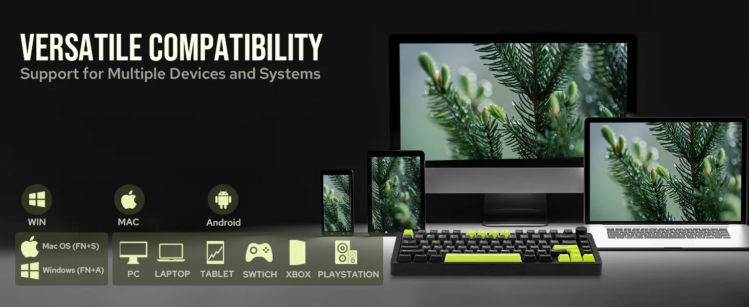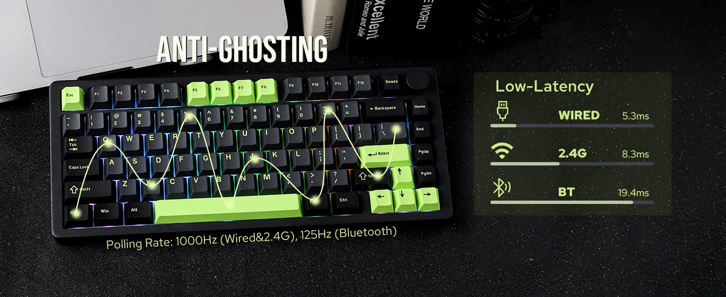 The Blade75 wireless gaming keyboard is built for versatility with tri-mode connectivity options, including Bluetooth 5.0, 2.4GHz wireless, and Type-C wired connections. Whether you’re gaming, working, or just browsing, this wireless keyboard offers effortless connectivity and stability. Thanks to its impressive 4000mAh battery, you can experience longer wireless sessions, significantly decreasing the need for constant recharges and keeping your attention on your work.