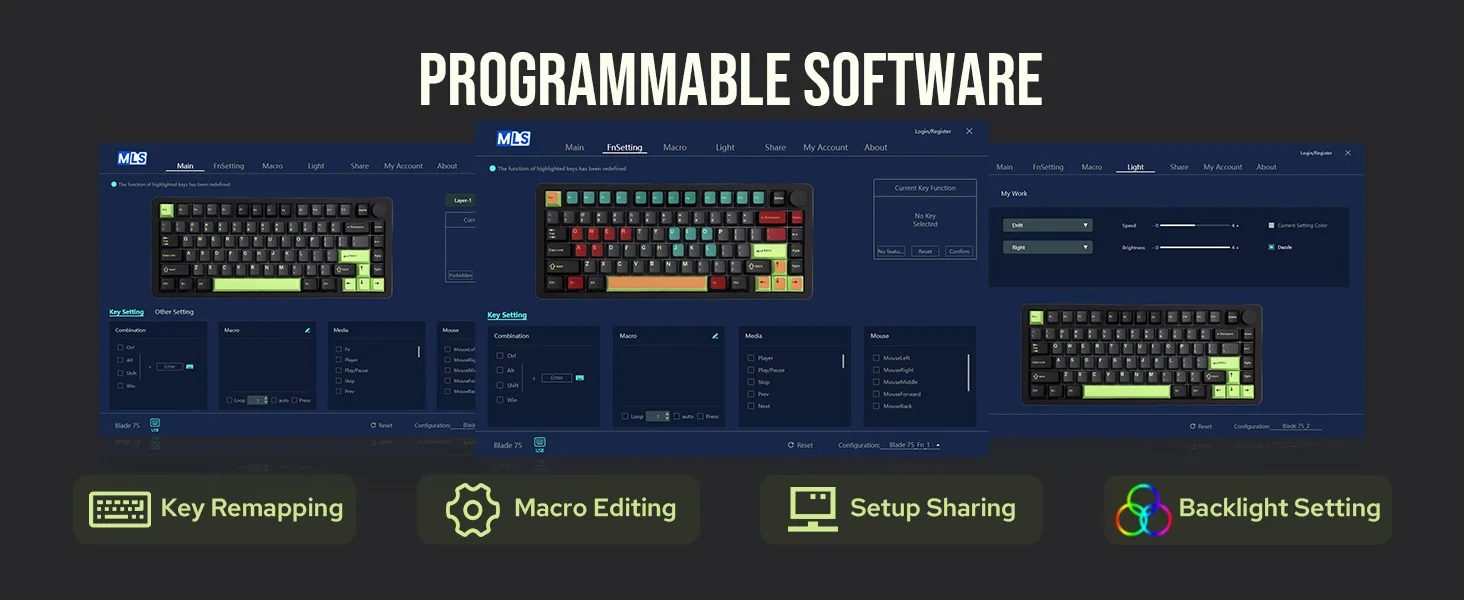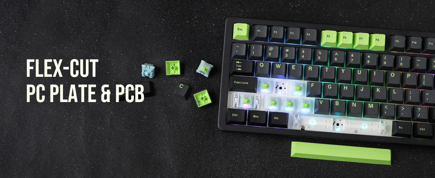 The Flex-cut PC plate in the Blade75 mechanical keyboard enhances flexibility, offering a softer typing feel and improved acoustics. When combined with finely-tuned plate-mounted stabilizers, this setup ensures that each keypress is smooth, reliable, and noise-free, positioning the Blade75 as an excellent choice for users seeking both functionality and comfort.