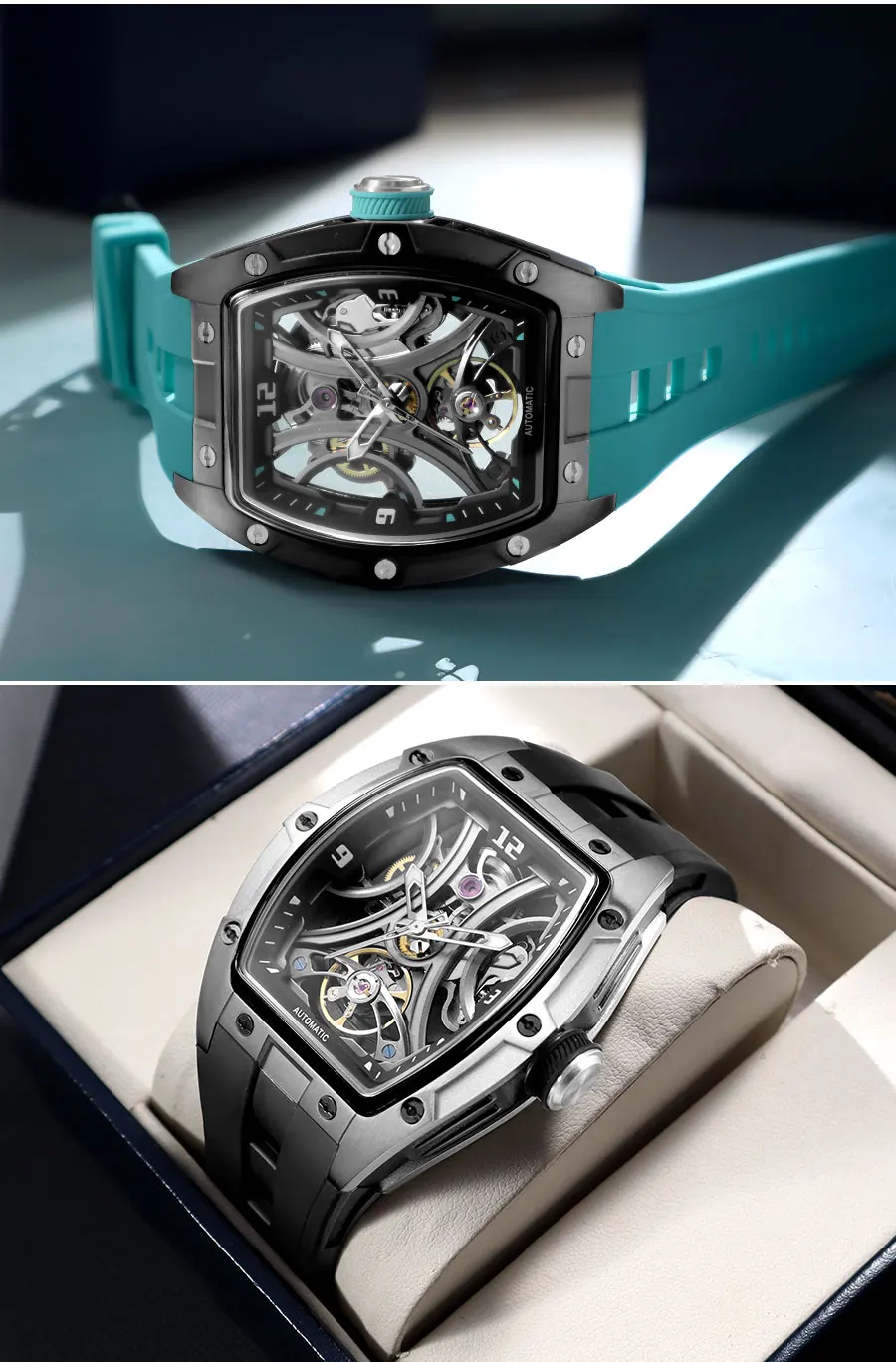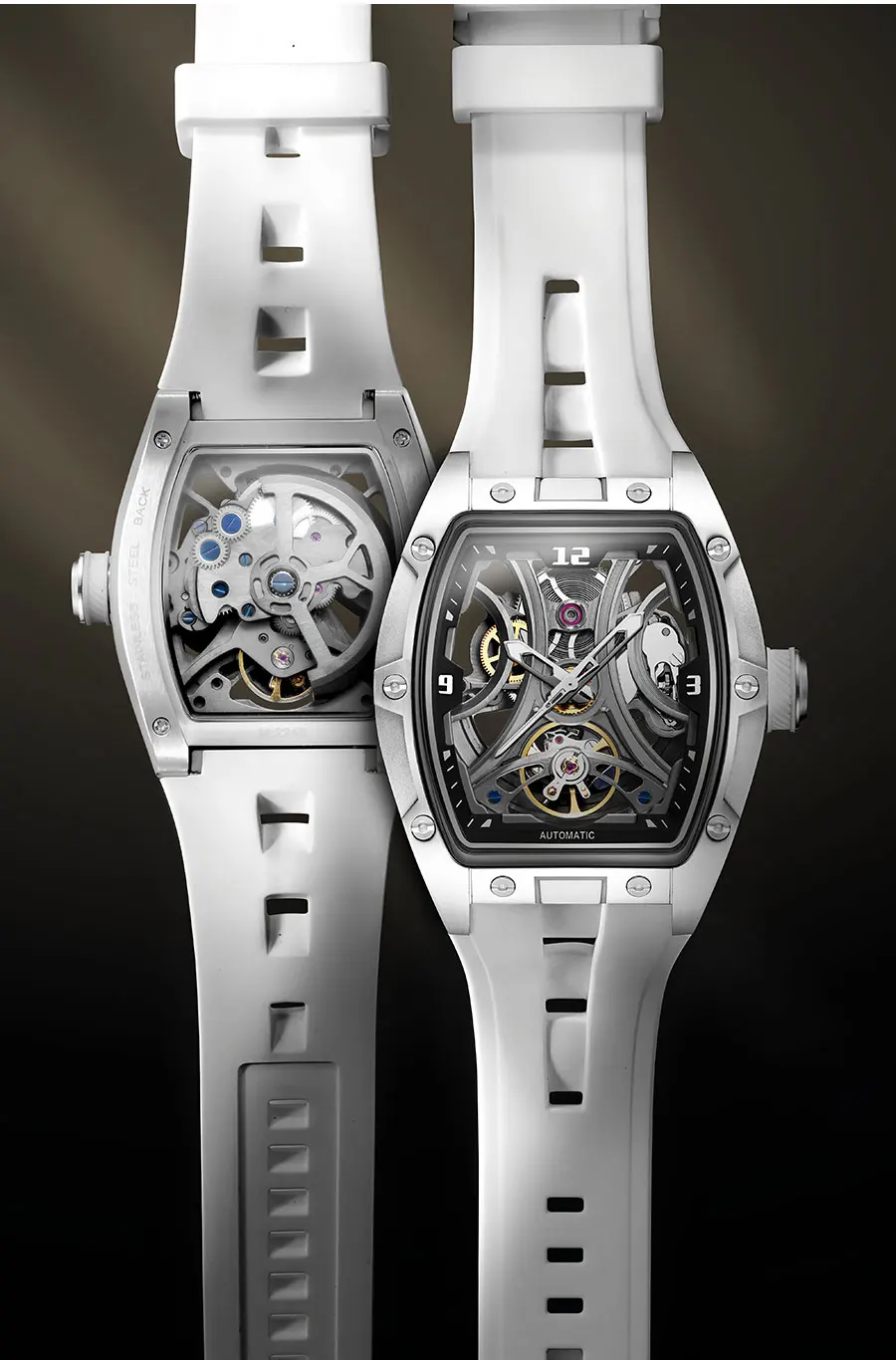 MEGIR Fashion Sports Mechanical Watch for Men Automatic Self-winding Wristwatch with Silicone Strap Transparent Tonneau Dial