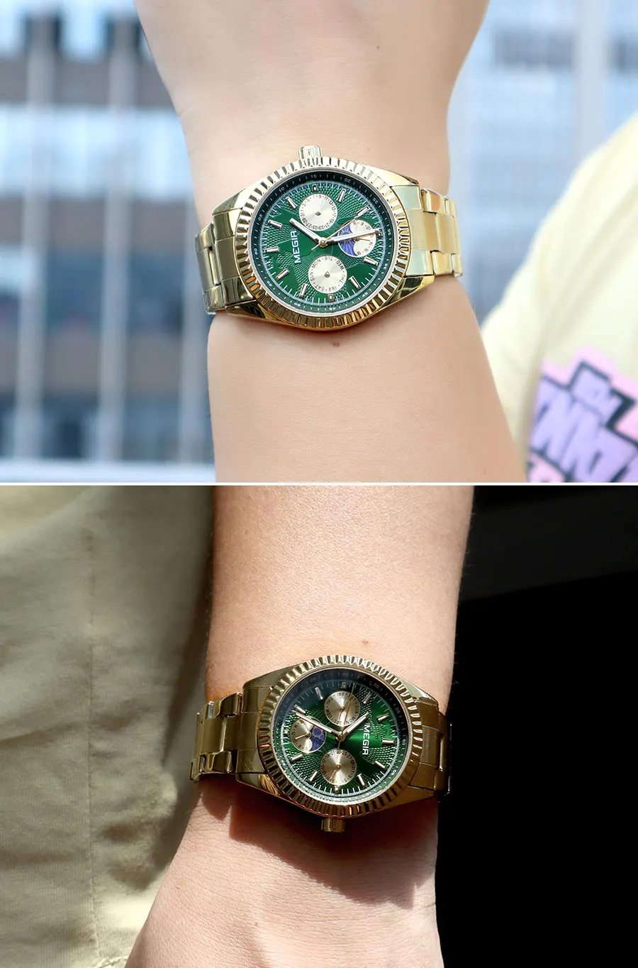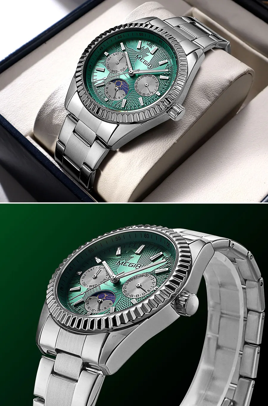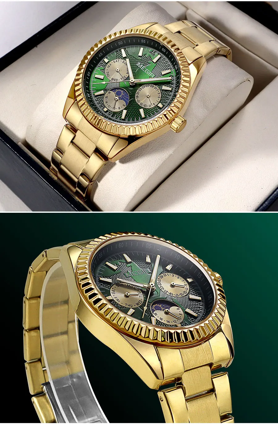 MEGIR Men's Quartz Watch with Stainless Steel Strap Fashion Business Style Wristwatch with Day Date 24-Hour Moon Phase Function