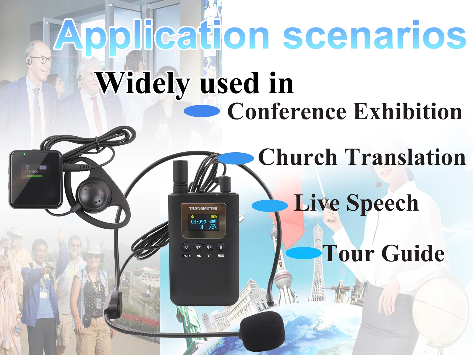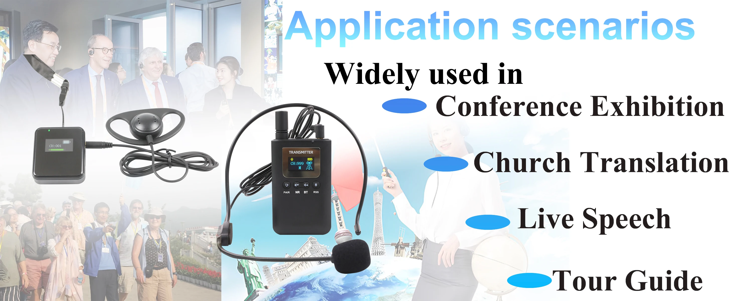 Widely used in the tourist group service, simultaneous interpretation, gathering, congregation's pilgrimage, teaching, training, conferences, etc.