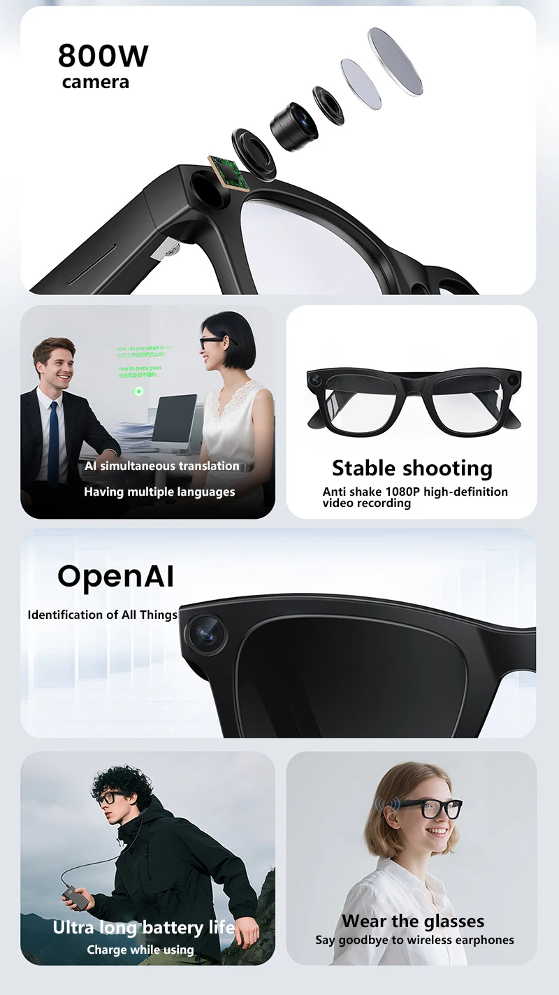 Rich, Immersive Sound: Experience high-fidelity audio with deep bass through dual stereo speakers integrated into both temples. Perfect for music, calls, and audio prompts.