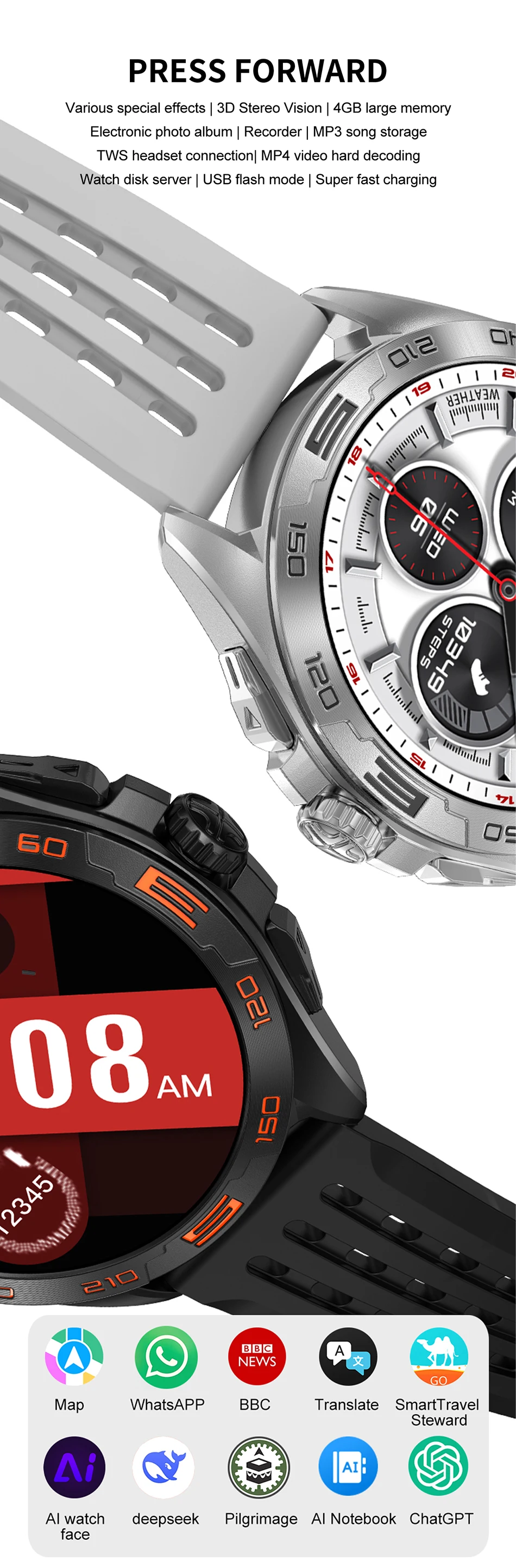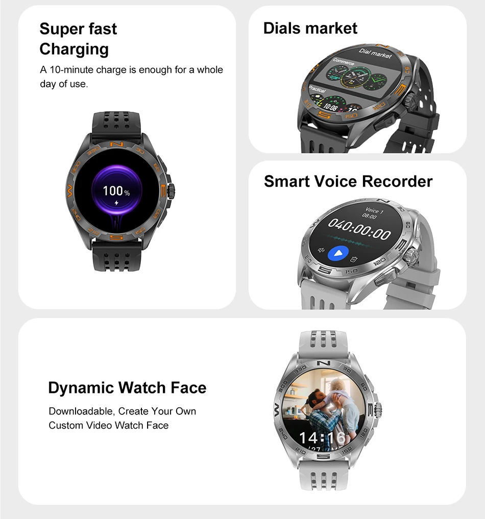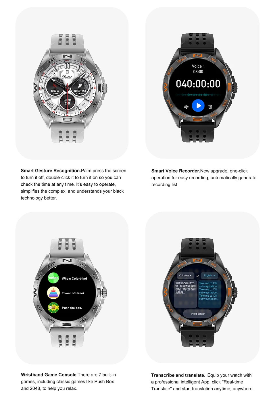 Main Functions: Bluetooth call, 11 sets of menu styles, support for more than 200 dials, breathing training, custom dials, stopwatch, brightness adjustment, multi-sport mode, real sleep, real heart rate, message push, remote music, remote photo, real-time weather, find phone (connected to the phone to use), bluetooth music playback, password protection, calculator, split-screen display, shortcut widgets, weather Wearpro, Women's Assistant, Massager, Voice Assistant, Alarm Clock, Flashlight, Battery Saving Mode, Smart and Watch Mode Selection, One Time Link, Explosion-proof Glass, Compass, Multiple Games, Multiple Off-screen Clocks, Individual Ringtones