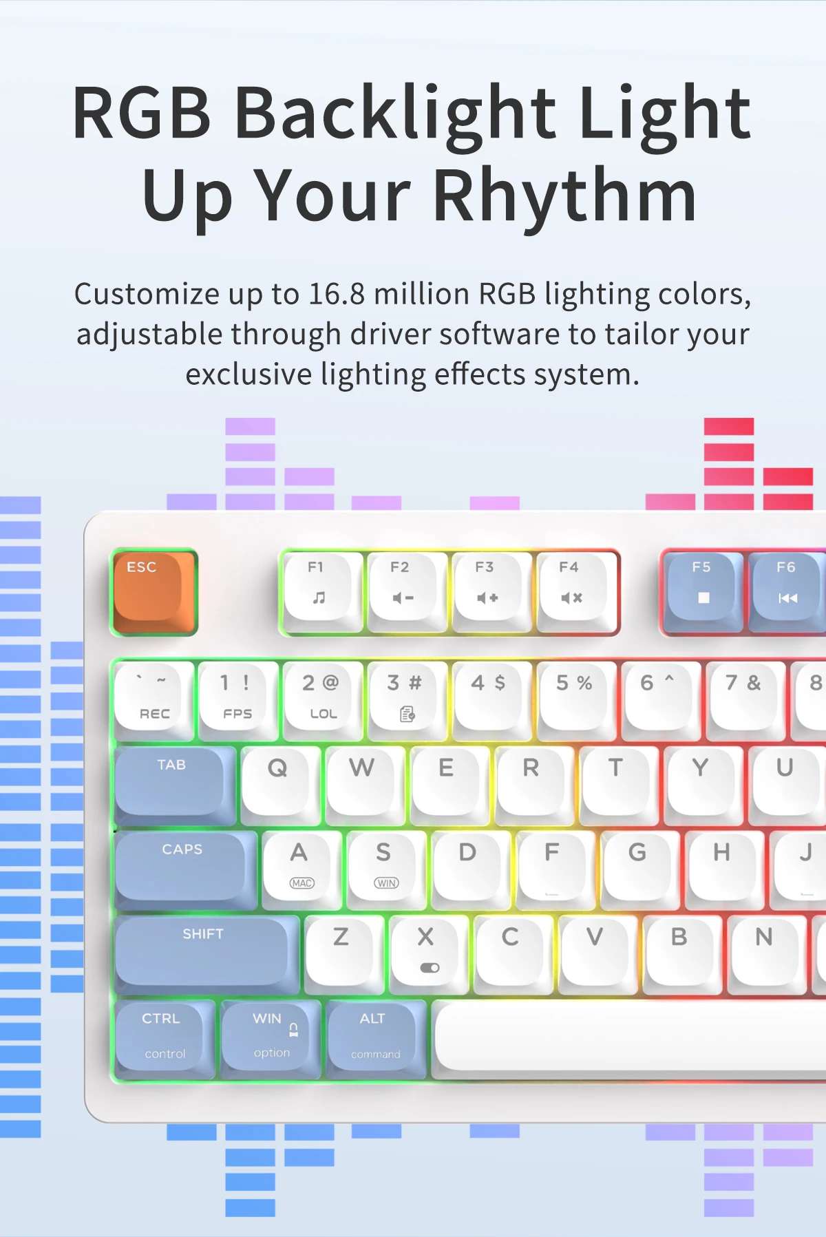 Vibrant RGB Lighting: Immerse yourself in a world of color with programmable RGB lighting. Choose from 16.8 million hues to create your personalized environment and sync it with your favorite music rhythms. The south-facing LED design and two-color injection molded non-shine keycaps emit soft RGB lighting, enhancing your gaming or work setup.