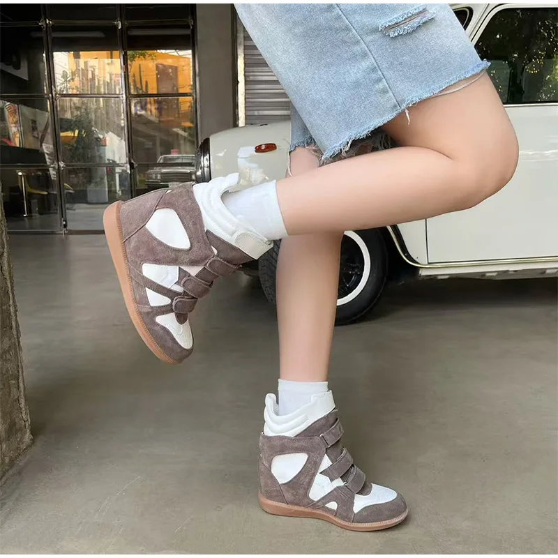 Brand Leather Wedge Sneakers Hook Loop Fastener Hiking Boots Women Thick Sole Platform Height Increasing Shoes Ankle Short Boots