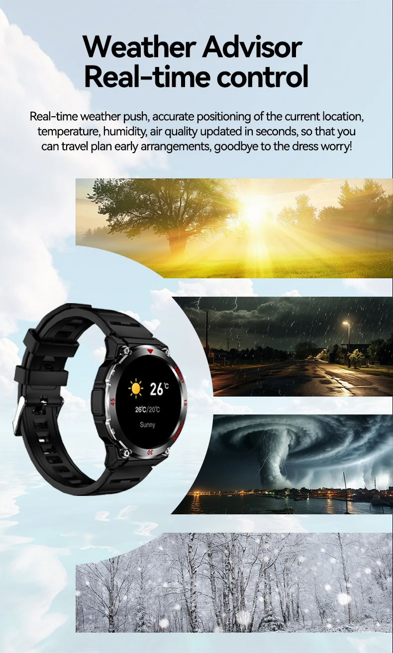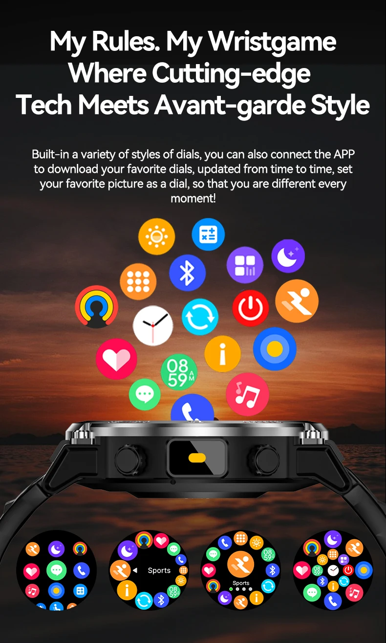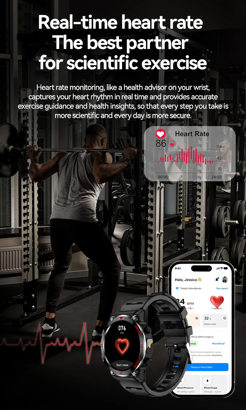 Health monitoring: real-time heart rate, SpO2 (blood oxygen), blood pressure, sleep monitoring.