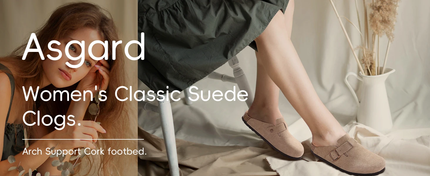 Men's and women's suede clogs, leather mules, cork soles, and cowhide Birkenstocks