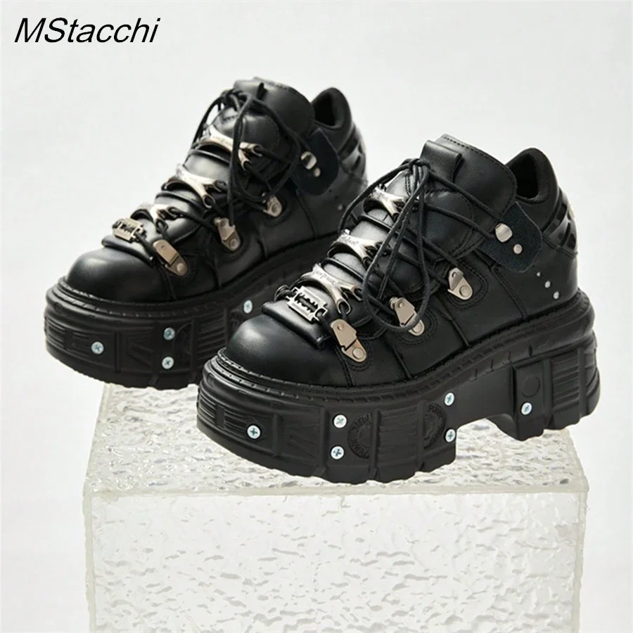 Punk Style Women Black Shoes Rock Metal Decor Lace-up Heel Height Platform Shoes Gothic Man Sneakers Women Ankle Boots 2025 New