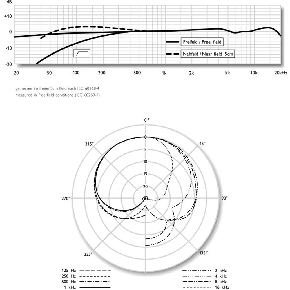 The BCM 104 has a fixed cardioid pattern with excellent rejection of rearward sound. Its frequency response is very linear with a gentle presence boost around 4 kHz and a slight treble lift above 10 kHz for enhanced speech intelligibility. Due to its outstanding transient response, the BCM 104 captures each nuance of the human voice with stunning detail. Because of its wide frequency response, the BCM 104 can be used for much more than speech applications, e.g. sung vocals and a wide variety of instruments.