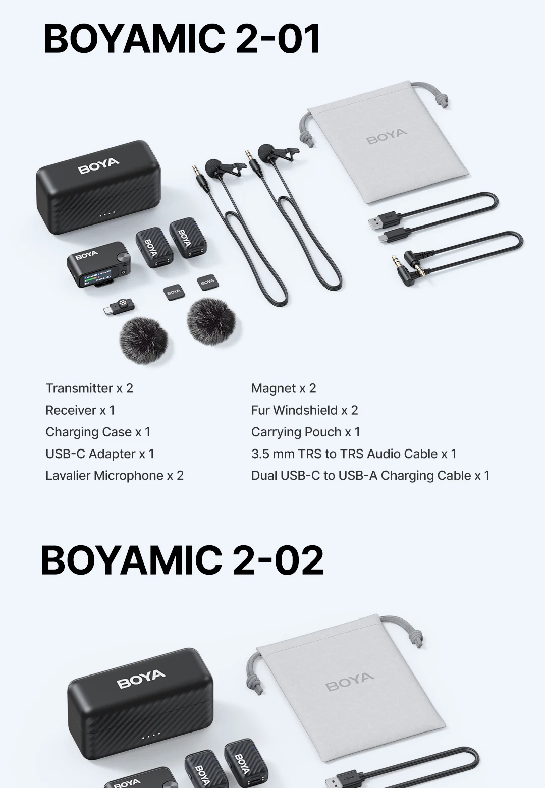 The BOYAMIC 2, a 2.4 GHz Ultra-Mini Wireless Microphone System, features8 GB of internal storage, allowing it to record independently withoutreceiver, ensuring secure audio data storage. Additionally, the transmittersupports 32-bit float recording, capturing clear and authentic sounddetails even in sudden loud or quiet environments. Each transmitter canconnect to up to four receivers simultaneously, meeting the needs ofmulti-device collaboration.The BOYAMlC 2 is ideal for content creation,live streaming, vlogging, mobile journalism, and much more.