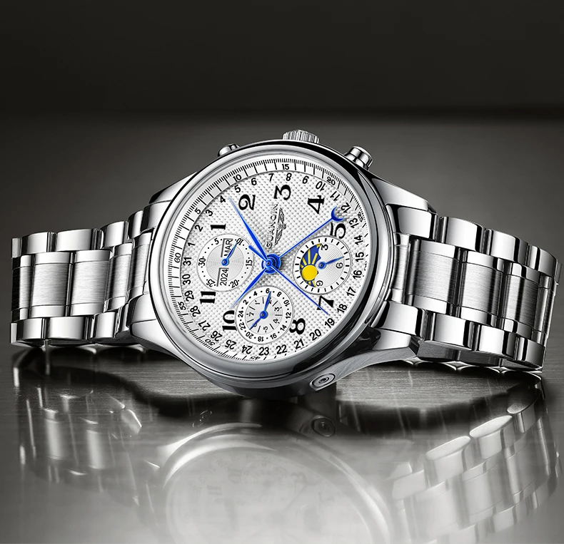 Integrates day, month, year, 24h, 12h, 60s bezel & calendar display.Maximizing functional versatility,business-inspired minimalist design, streamlined elegance that follows your every move.Innovative hand design, 3D embossed logo, ergonomic multi-function crown. Refined masculine elegance with meticulously crafted details.