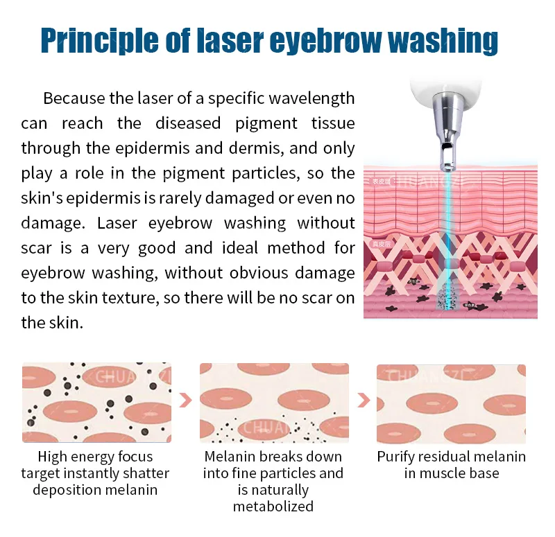 1. Remove the black &blue pigment on eyebrow, eye line and lip line. Scour off tattoo, freckle, lentigines, old aged marks, vascular expansion and type of blood vessel lesions etc.