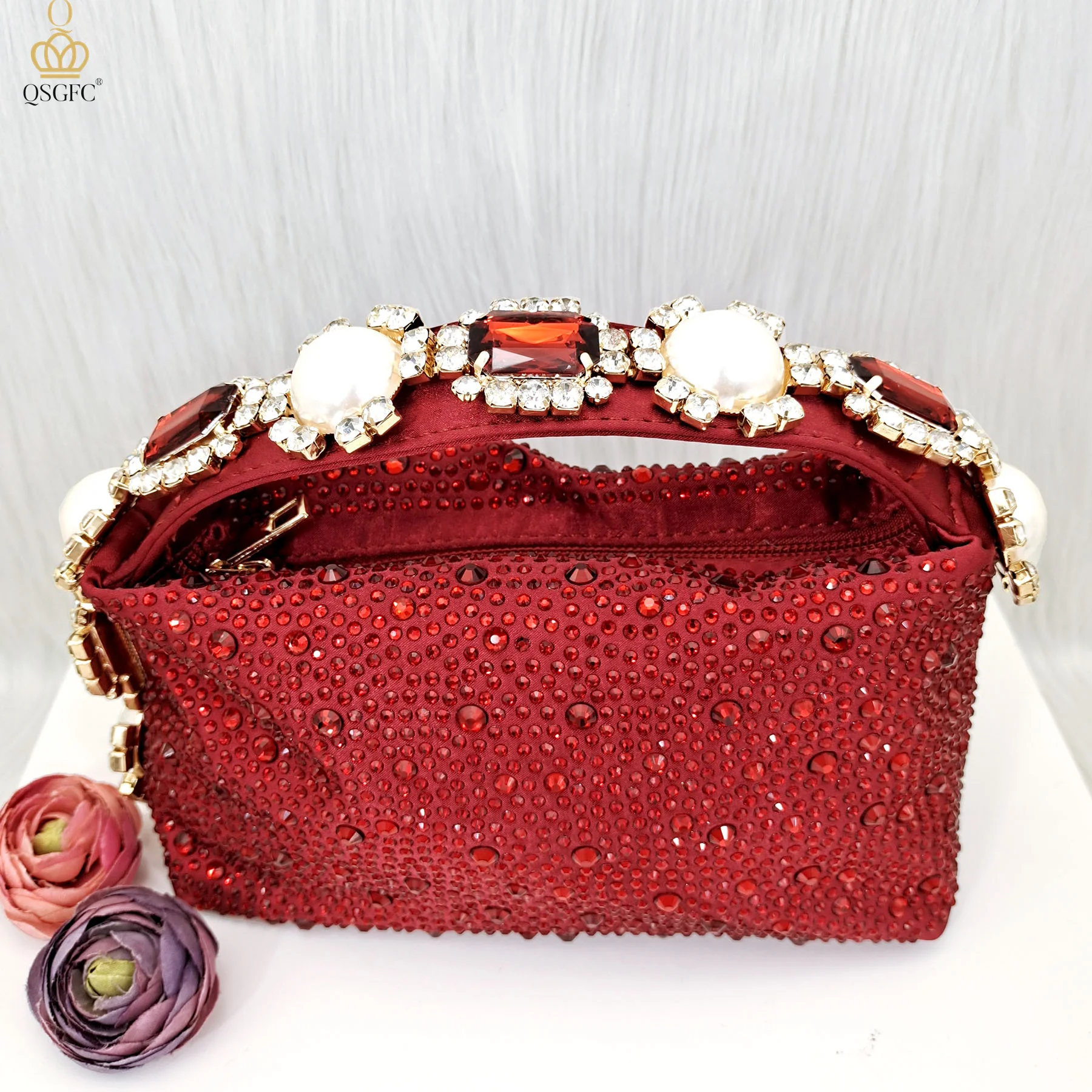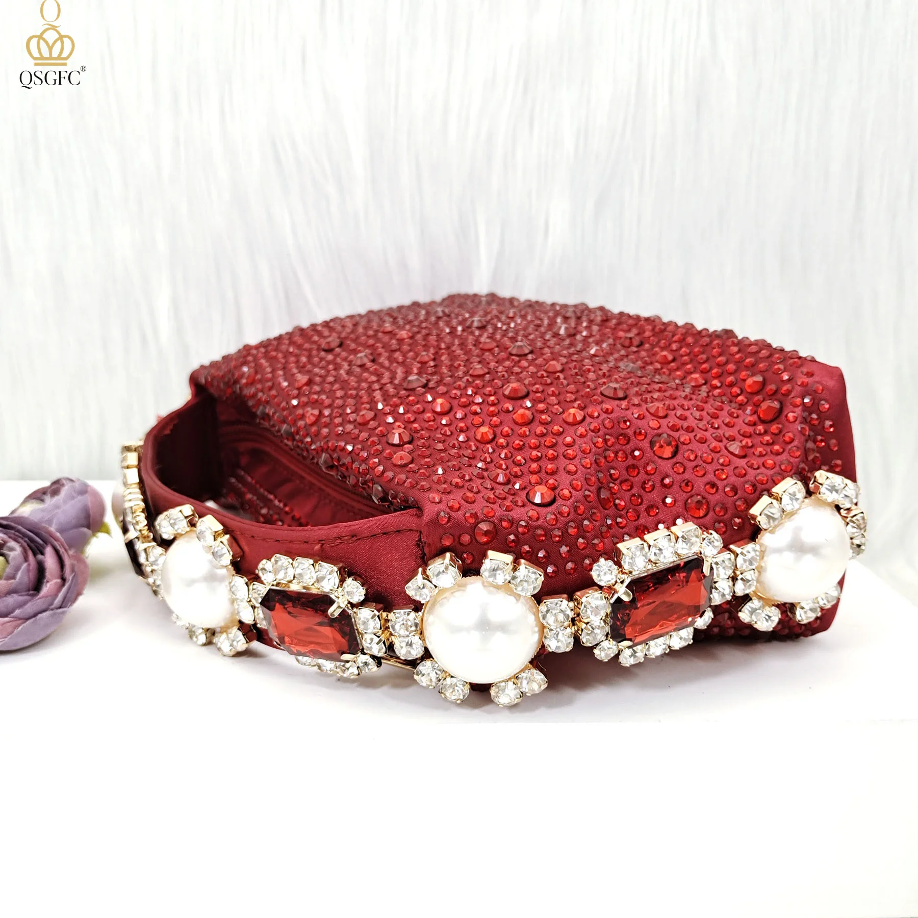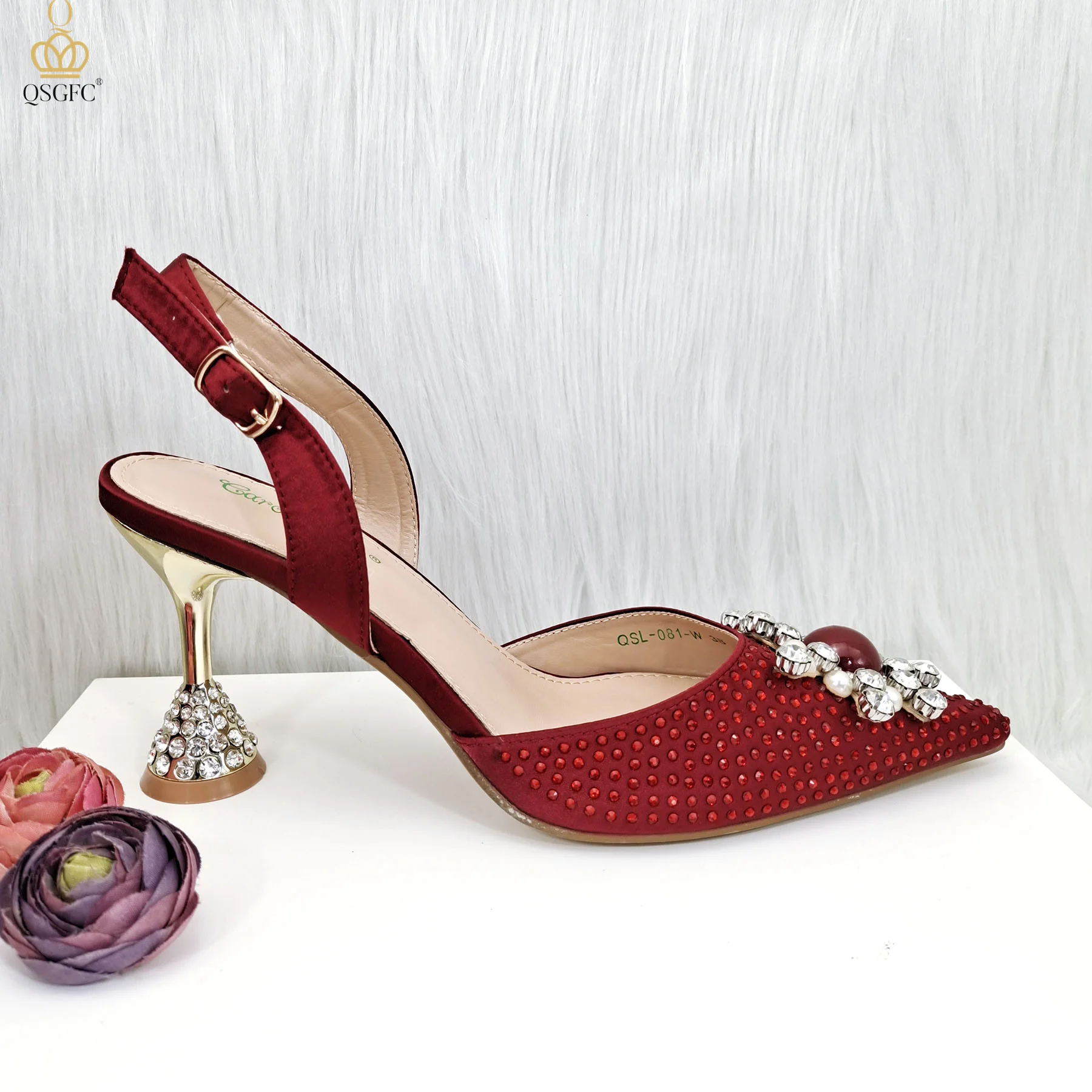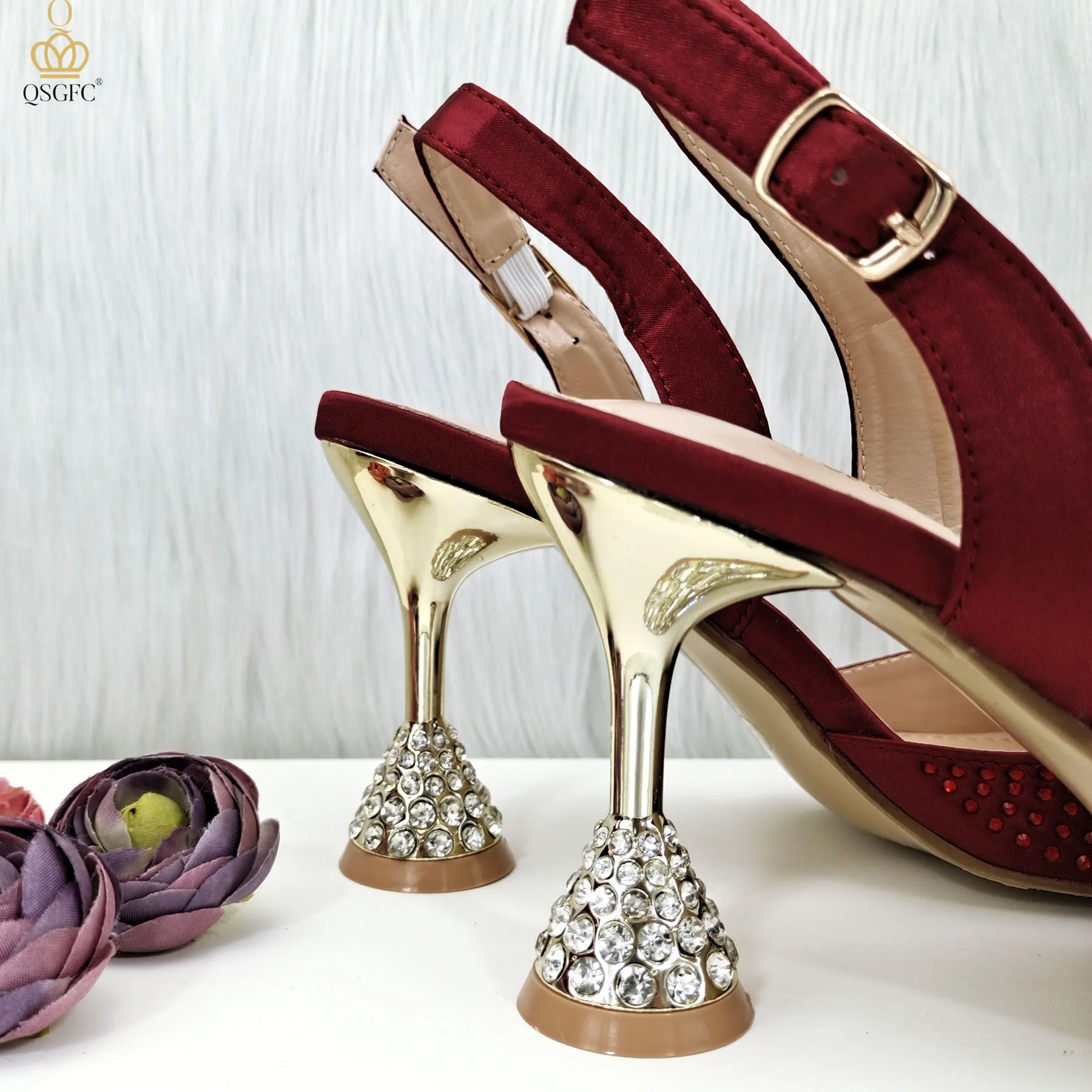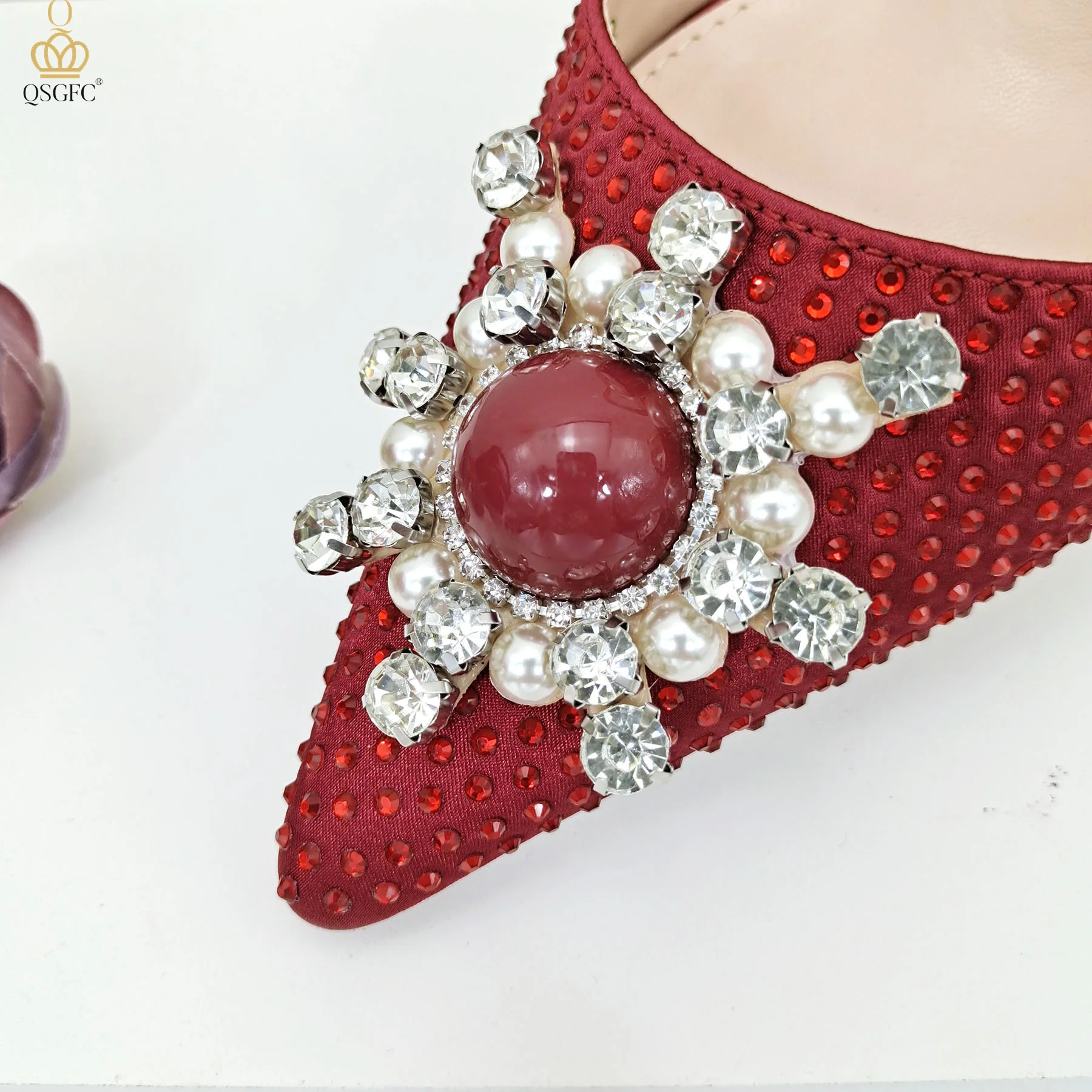 QSGFC 2023 Luxury SSS Grade Burgundy High Heels Metal Diamond Chain Decorative Handbag Fashion Banquet Shoes Bag Set For Women